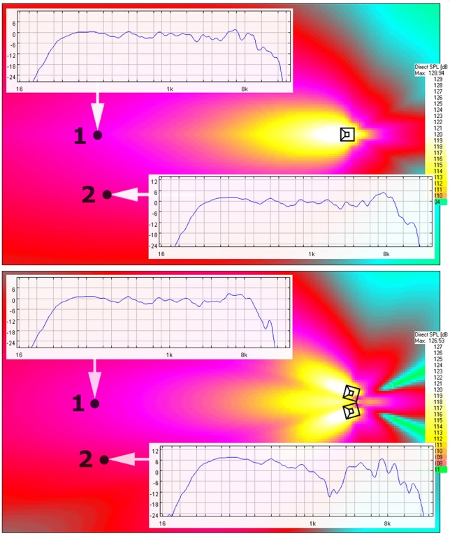 Pierwszy rodzaj współdziałania to współdziałanie między dwoma i więcej akustycznymi systemami. Gdy dodaje się druga AS, stwarzane oboma systemami fale współdziałają między sobą. Taka kombinacja rozniesionych źródeł dźwięku doprowadziła do pojawienia dużej nierównomierności charakterystyki amplitudowej dźwiękowego pola w obszarze. To jest prawdziwie dla wszystkich rodzajów AS i również dla jakichkolwiek konstrukcji masywów, bez względu na zapewnienia w przeciwległym z boku działów marketingowych firm-producentów. Rysunek 1 ilustruje, jak wykres ukierunkowania klasteru z dwóch systemów różni się od wykresu ukierunkowania jednego analogicznego AS.