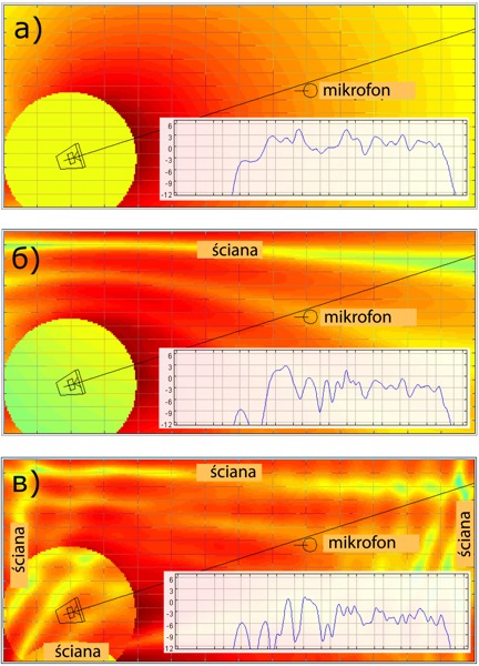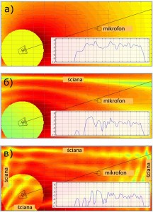 Rysunek 2. Ilustracja współdziałania akustycznego systemu i odzwierciedleń w pomieszczeniu: obraz dźwiękowego pola na częstości 500 Hz i jego charakterystyka amplitudowa: a) przy nieobecności odzwierciedleń, bezechowa kamera, b) przy obecności jednej odbijającej ściany, c) w otoczeniu czterech odbijających ścian, Obserwujcie za zwiększeniem nierównomierności charakterystyk przy dodaniu odbijających powierzchni