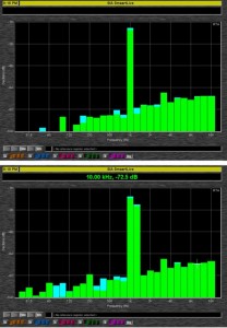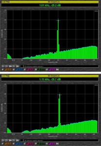 Rysunek 3. Błąd przy ocenie szerokości pasma w 1/3 oktawnych analizatorach: oba procesy − faly sinusoidalne, pierwsza na częstości 1 kHz, druga − na częstości 1110 Hz. Jeśli wierzyć temu RTA, drugi proces za swoim spektrum jest dwukrotnie szerzej
