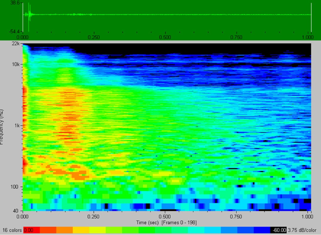 Rysunek 5. Komputerowy analizator, który może wymierzać i wszechstronnie określać impulsową charakterystykę akustycznego systemu. Dla rozumienia akustycznych procesów jest ważnie widzieć nie tylko spektrum dźwiękowej energii, ale i dynamikę jej zachowania na różnej częstości w czasie. Wyraźnie widać dominujące odbicie w szerokim spektrum częstości, powstające w przybliżeniu przez 170 ms po odtworzeniu prostego sygnału