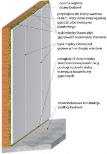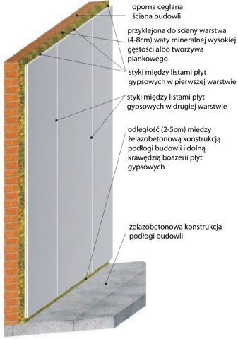 Dowożę bardzo prosty sposób, jak spotęgować izolację dźwiękową ściany. Powierzchnia ściany okleja się tworzywem piankowym grubością od 4 do 8 centymetrów. Jak sklejający skład trzeba wykorzystywać tylko sklejające szpachlowanie, które można nabywać w jakimkolwiek sklepie materiałów budowlanych. Zwykle ona paczkuje się do papierowych worków porcjami po 25 kilogram. Nad tworzywem piankowym za pomocą tego że szpachlowania nalepiają się listy płyty gypsowej grubością 12 mm. Listy płyty gypsowej muszą szczelnie przylegać jeden do jednego. W tym że czasie między nimi i opornymi konstrukcjami budowli po całym obwodzie ściany trzeba zostawać luz 1-3 cm, czyli unikać bezpośredniego kontaktu przekrojów poprzecznych płyt gypsowych z budowlą. W pewnych wypadkach w zamian tworzywa piankowego można wykorzystywać listy mineralnej waty Rockwoll grubością 5 cm i gęstością 80-120 kg/m3. W tym wypadku luz między dolną granicą listów płyty gypsowej i konstrukcyjną podłogą budowli trzeba powiększać do 5-6 cm, ponieważ z czasem gypsowe warstwa pod swoją wagą mogą «spełznąć» na kilka centymetrów (patrz rysunek 10).