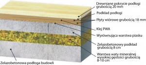 Po układaniu drugiej warstwy płyt gypsowych tak samo podciął i zawiera się warstwa płyty wiórowej. Potem przymierza się, kroi się i zawiera się jeszcze jedna warstwa płyty wiórowej; przy czym należy śledzić, byle styki między listami w obu warstwach nie zbiegały się. Po «przymiarki» górna warstwa płyty wiórowej fotografuje się i wynosi się do sąsiedniego pomieszczenia. Dolna warstwa płyty wiórowej gęsto przesiąka klejem PWA, potem z wierzchu zawierają się zawczasu przygotowane listy płyty wiórowej górnej warstwy. Nie czekając pełnego wysychania kleju, obie warstwy płyty wiórowej przywiązują się jeden do jednego z interwałem 20-25 cm wkrętami długością 35 mm. Wszystkie prace po impregnowaniu klejem dolnej i układaniu górnej warstwy płyty wiórowej robią się jakby po strefach: zaczynamy z dalekiego kąta pomieszczenia i, w miarę układania górnej warstwy płyty wiórowej, postępujemy do wejściowych drzwi. Po całym dokonaniu dana konstrukcja musi dobrze przeschnąć w ciągu doby. A propos, otrzymana konstrukcja (bez twarzego pokrycia) ma grubość w przybliżeniu 10-14 cm.