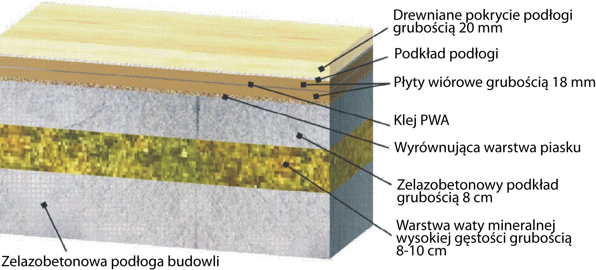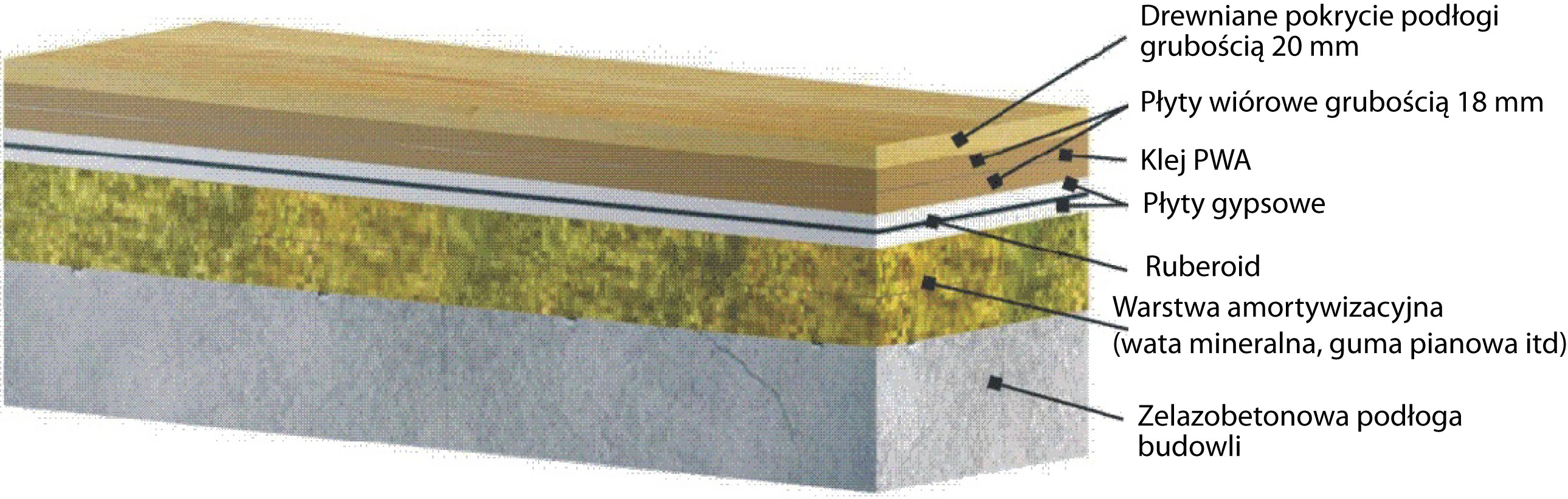 W wypadku, pokazanym na rysunku 12, na podłodze jest zawarta 8-centymetrowa warstwa z mineralnej waty wysokiej gęstości nad mocną polietylenową błoną. Ta błona chroni od wilgoci, która może być w opornej konstrukcji podłogi budowli. Jeszcze jedna warstwa z polietylenowej błony zawiera się już z wierzchu na mineralną watę, byle, po pierwsze, nie dać wilgoci przeniknąć do jej z wierzchu przy zalewaniu nad nią 8-10-centymetrowej warstwy betonu i, po drugie, nie dać samemu betonowi przeniknąć do górnej warstwy mineralnej waty. Przecież jeśli chociaż trochę betonowy rozczyn przeniknie do mineralnej waty, to, wysechłszy i zaskoczywszy, on zrobi jej górną część bardziej szorstką, czym odpowiednio skróci grubość «sprężystej» warstwy. Przed zalewaniem betonowej warstwy zawiera się armaturna siatka dla dodawania jej większej mocy i zapobiegania utworzeniu pęknięć pod obciążeniem. Potem, jak beton ostatecznie będzie przeschnął, on zasypuje się 2-3-centymetrową warstwą piasku – częściowo dla wyrównywania, a częściowo – dla akustycznego dempingu ostatecznego wykładania podłogi z płyt wiórowych, listów dykty albo blatów. Przy czym drewniane wykładanie podłogi trzeba robić w trzy warstwy tak, by one kryły jedna jedną, nie dając stykom zbiec się. Każda późniejsza warstwa przykleja się do poprzedniej klejem PWA i ściąga się wkrętami długością 35 mm jeszcze do tego, jak wyschnie klej. Wreszcie, u nas wychodzi lita skomplikowana kompozytna warstwa, która nie stwarza zauważalnego rezonansu.