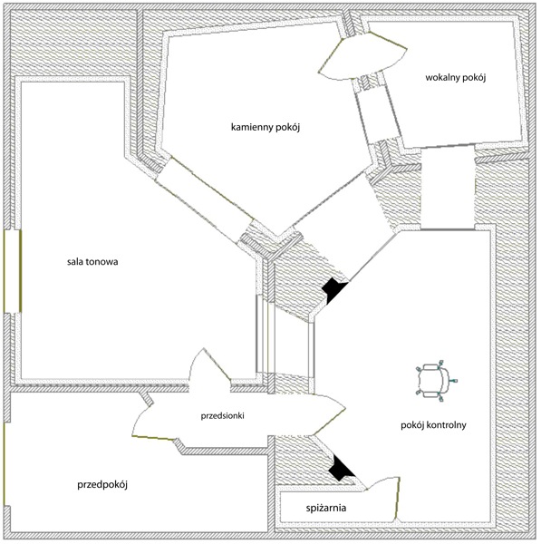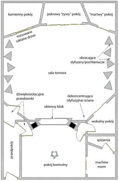 - Tylna ściana kontrolnego pokoju powinna być całkiem powlokła się dźwiękochłonnymi konstrukcjami. Ustawienie w niej drzwi, okien i innego wyłącza się.