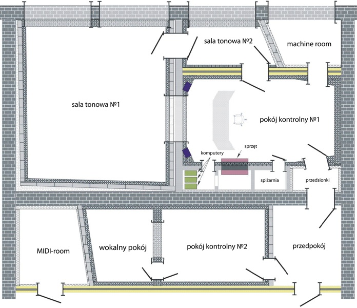 Dopuścimy, że u nas już jest pomieszczenie pod studio, a także projekt planowania studyjnych pomieszczeni. Niepotrzebne ściany już są zniesione. Dopóki nie zaczęliśmy budować wewnętrzne studyjne przegrody, trzeba odpowiednio do projektu przeciągnąć siłowe kable (prąd), uziemienie, przewidzieć wprowadzenie i wyprowadzenie systemów wentyłacji i klimatyzacji i inne (o to mówiło się w pierwszym artykule naszego cyklu). W większości wypadków podstawą wewnętrznej studyjnej przegrody będzie ceglana ściana. Ale – nie zawsze. Na przykład, nie obowiązkowo sprowadzać właśnie ceglaną ścianę między spikerem i niewielkim kontrolnym pokojem, ponieważ w tym wypadku dużych poziomów dźwiękowej presji nie oczekuje się, dlatego z izolacyjnymi dźwiękowymi zadaniami w całości sprawią się akustyczne błony obu pomieszczeni. Chociaż obecność ceglanej ściany nie będzie zbędnej w jakimkolwiek razie.
