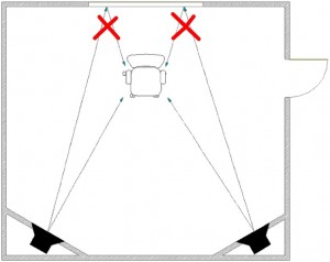 Najkrytyczną w tym stosunku jest tylna ściana kontrolnego pokoju, ponieważ ona praktycznie pod kątem prostym przejmuje na siebie całą energię promieniowanych dźwiękowych fal od monitornego systemu, a wszystko, co powraca od tej ściany, będzie zabarwiał postrzegany w pokoju dźwięk. Nie mniej krytycznym jest i sufit, ponieważ on znajduje się naprzeciw podłogi, która odbija dźwięk. Krytycznymi są również boczne ściany, zwłaszcza ich odcinki od frontalnej ściany do warunkowej linii, która, będąc obocznej frontalnej ścianie, przecina pozycję inżynieru dźwięku.