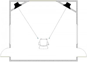 - Najpierw określają się miejsca ustawienia głównych monitorów. Oś promieniowania monitorów musi znajdować się w poziomej płaszczyźnie. Wyłącza się ustawienie monitorów w kątach pomieszczenia. Ustawienie drzwi, okien i innego planuje się tylko potem, jak są określone miejsca ustawienia monitorów.