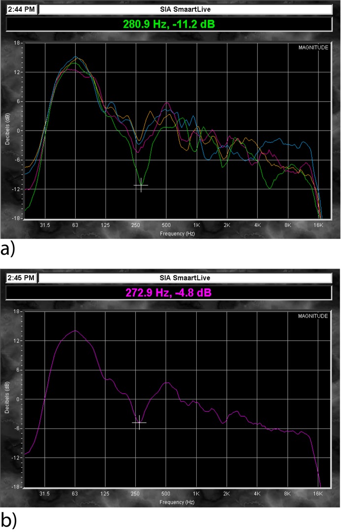 Рисунок 6. Діагностика концертної звукопідсилювальної системи за допомогою SIA SmaartLive: а) зібравши декілька АЧХ, отриманих у різних точках залу, можна робити висновки про загальні тенденції у звучанні. На всіх показаних АЧХ є присутнім провал у районі 280 Гц, що вказує на глобальний характер аномалії − непогодженість між НЧ і СЧ-головками гучномовців у часі або відбиття від підлоги. Інші гострі провали, як бачимо, носять локальний характер і є наслідком горизонтального розташування колонок у масиві. б) АЧХ, усереднена за даними кривих. Загальні тенденції залишилися, локальні суттєво втратили своє значення
