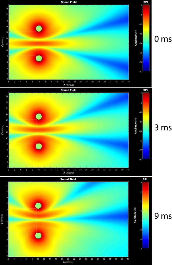 Щоб зрозуміти принцип, спростимо завдання, помістивши по краях сцени на відстані 1 м один від одного по одному субвуферу. Енергія, випромінювана, відповідно лівим і правим субвуфером, буде приходити одночасно тільки на лінії симетрії, яка лежить по центру між порталами, де відстань до кожного із субів однакова. Рухаючись ліворуч від цієї лінії, одержуємо деяку різницю ходу. Поки різниця відстаней менша довжини напівхвилі найвищої робочої частоти, значних змін у звучанні не відбувається, бо ще немає фазової компенсації (cancellation) і чистота низькочастотного впливу не страждає − пружний, повноцінний низькочастотний край. Рухаючись далі ліворуч, попадаємо в точку, де довжина хвилі на частоті, скажімо, 80 Гц збігається з різницею ходу звуку від субів у точку прослуховування і відбувається практично повне придушення звукової енергії. Рухаємося далі − і придушення вже відбувається на іншій частоті, наприклад, 70 Гц. Так, у кожному місці площадки утвориться свій унікальний характер звучання, звук збіднений у порівнянні з вихідним через «гребінку» на частотній характеристиці. До того ж, еквалайзером ці провали не виправити, по-перше, тому, що на кожному провалі придушення повне (цієї частоти просто немає, підсилювати нема чого), по-друге, тому, що дана аномалія локальна і штучне коректування за допомогою фільтра викличе небажаний підйом на цій частоті в інших напрямках (де вібрації на цій частоті й так мають достатню амплітуду). Якщо на більш високих частотах провали будуть вузькими та щільно «упакованими», так що на слух можуть бути нерозпізнані, то на низьких частотах цього не буде − «пелюстки» широкі і слух здатний розрізняти їх по частоті. На рисунку 7 змодельовано поводження звукового поля рознесених джерел. Добре видно «гарячу» зону, яка поширюється, а згодом переміняється з боків глибокими провалами (чим не коридор?) і міняє свою ширину залежно від частоти.