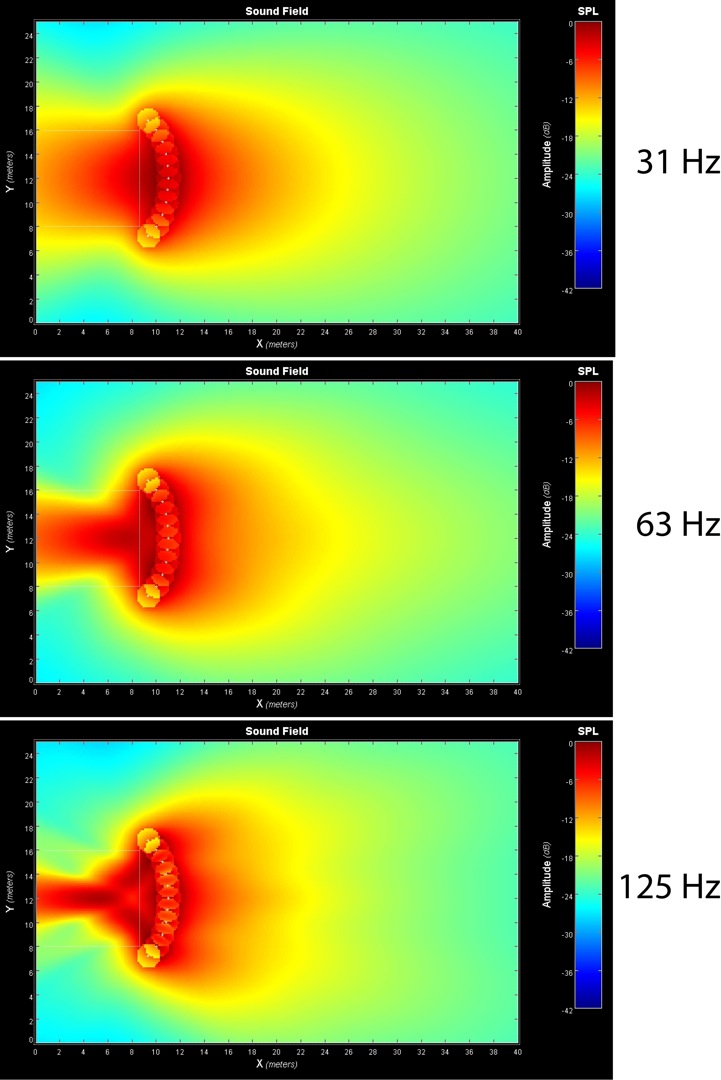 Рисунок 4. Симуляція акустичного поля горизонтального кластера з трьох стандартних турових модулів: звуковий тиск на 1/3-октавних смугах, відбиття відсутні. Симулятор EASE 3.0