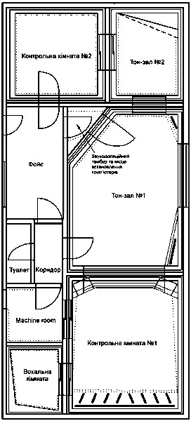 На рисунку 7 показаний один з варіантів планування студійного комплексу, загальна площа якого становить близько 120 м2. У цій студії контрольна кімната № 2 переважно використовується як монтажна та для виробництва рекламних роликів, для чого, з міркувань зручності, біля неї розміщена дикторська кабіна. В цій контрольній кімнаті передбачені тільки монітори ближнього поля. Переважну більшість часу обидві контрольні кімнати із примикаючими приміщеннями, працюють як дві незалежних студії. Однак, якщо буде потреба, вони можуть залучати ресурси один одного, використовуючи гнучку комутацію, комп’ютерну та MIDI «сітку», переговорні пристрої. Біля контрольної кімнати № 1 розташований великий тон-зал з нейтральною акустикою. В обох тон-залах (великому та малому) збережені великі вікна з видом на вулицю. Невелика висота стель цього комплексу (біля трьох метрів) не дозволяла використати «в повний зріст» стельові низькочастотні пастки. Тому контрольна кімната № 1 розташована так, щоб основні монітори випромінювали звук уздовж неї. Стельові пастки розміщені в проміжку між фронтальною стіною й позицією звукоінженера. Звичайно, задня стіна зроблена максимально звукопоглинаючою, цьому сприяє й великий м’який диван, установлений біля неї. Машинної кімнати в даній студії немає, але передбачена ізольована й вентильована ніша для комп’ютерів і хард-дисків. В сусідній з нею ніші розташовані прилади, які не потрібні звукоінженеру постійно під рукою: конвертори, MIDI-інтерфейси, магнітофони та т.ін. Для кондиціонерів виокремлено невелике ізольоване приміщення праворуч від контрольної кімнати; воно ж використається як підсобне приміщення для проведення дрібних ремонтних і регламентних робіт і т.д.