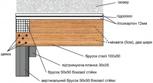 - проміжки між стельовими балками заповнюються двома шарами мінералвати щільністю 0,35-0,38кг/м3, які будуть підтримуватися або цвяхами, забитими з боків у стельові балки, або тонкими планками, прибитими знизу до стельових балок в перпендикулярному напрямку.