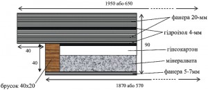 - в утворений простір всередині каркаса вирізається й укладається гідроізол, потім гіпсокартон розмірами приблизно 1830 х 530мм, а потім укладається мінералвата (два аркуші в один шар);