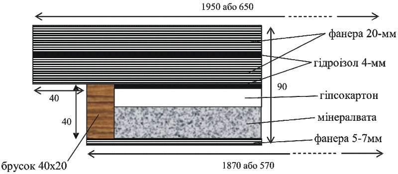 - із брусків 40 х 20мм збивається каркас із зовнішніми розмірами по периметру 1870 х 650мм;