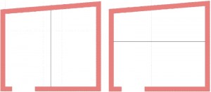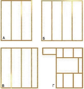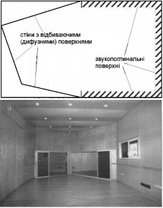 На рисунку 1 показаний один з таких варіантів, якій можна застосувати навіть у відносно невеликих приміщеннях. Стіни великої довжини в такому приміщенні виконуються у вигляді «пилки», одна сторона «зубів» якої є звукопоглинаючою, а інша − відбиваючою звук або дифузною. Акустичне оформлення іншої пари стін також неоднакове. Так, стіна, до якої звернена звукопоглинаюча частина «зубів» бічних стін, робиться звуковбирною, найчастіше із застосуванням низькочастотних пасток. А от протилежна їй стіна є відбиваючою або дифузною.