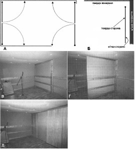 - збити каркас із брусків (рисунок 8б). Каркас збивається горизонтально на підлозі цвяхами довжиною 70-100 мм. Відстань між центрами брусків − 60 см. Довжина вертикальних брусків − 240 см. Довжина горизонтальних брусків − 245 см.
