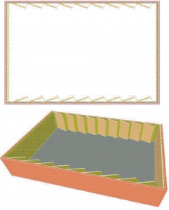 - для виготовлення стелі використовуються бруски 100 х 50мм, які вирізаються точно по ширині стелі приміщення. На кінцях цих балок вирізається виступ 50 х 50мм (рисунок 10). Балки заводяться в бічні стіни, піднімаються нагору й прибиваються до вертикальних брусків бічних стін (№1 та №3). Балки розташовані на відстані 60 см одна від іншої. Починати прибивати стельові балки треба з боку дверей.