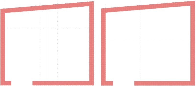 Розглянемо ще один варіант (рисунок 2). Технологічно він навіть простіше у виготовленні та в якості основи можна використовувати приміщення з нейтральною акустикою. Зміст цього варіанта в тому, що одна частина приміщення робиться максимально звукопоглинаючою, а інша − за рахунок обробки стін та стелі − робиться дифузною з періодичним вкрапленням відбиваючих поверхонь, при цьому в «живій» половині треба домагатися максимальної непаралельності поверхонь, щоб уникнути виникнення стоячих хвиль або деренчливої луни.