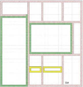 Рисунок 9. Каркас акустичної оболонки 4-ї стіни (в масштабі). Положення луток дверей та внутрішньо студійного вікна виділено зеленим кольором. Вони будуть встановлені пізніше.