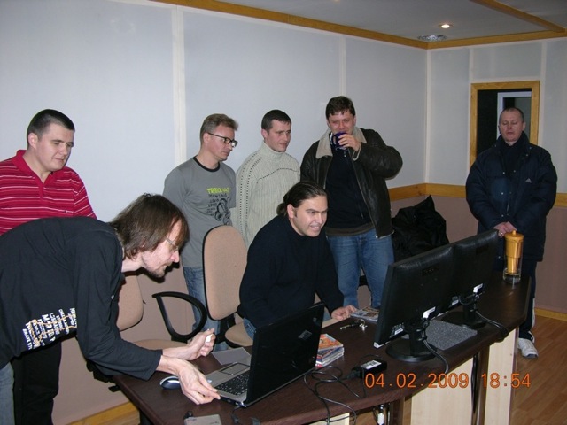 Ми з Олегом відійшли на півгодини повечеряти й зібратися у зворотну дорогу. Коли ми повернулися, у студії була по-справжньому дружня атмосфера (фото 7). Часу залишалося мало. Ми з Олегом коротко розповіли про монітори, продемонстрували їхні можливості, відповіли на ряд цікавих питань. Потім був обмін номерами телефонів, візитками та т. ін. А через ще кілька хвилин ми в піднесеному настрої вже їхали додому.